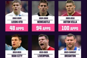 米尔纳英超生涯出场次数分布:代表利物浦230场最多,曼城147场